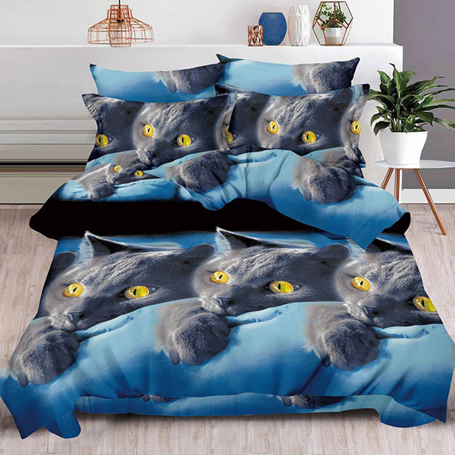 Комплект 3D спално бельо от 6 части - син цвят с черни котки - B6-24