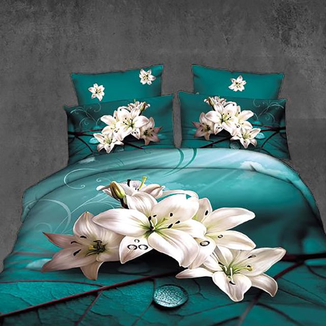 Комплект 3D спално бельо от 6 части - цвят тюркоаз с бели цветя - B6-23