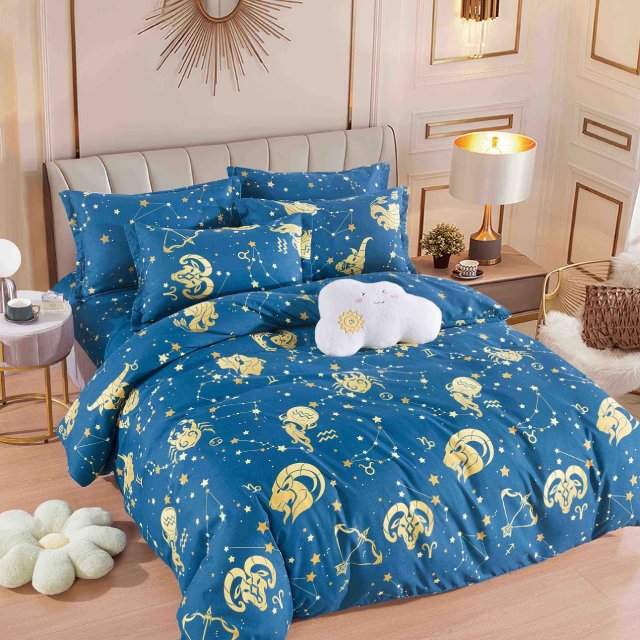 Единично спално бельо от 100% памук – синьо със златни зодии - F1-90