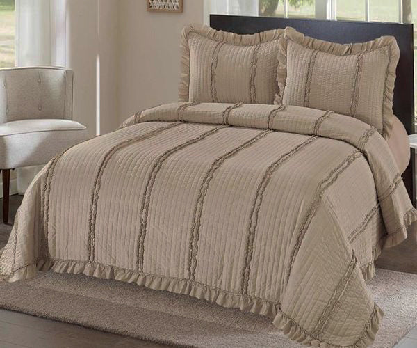 Освежете вашето пространство с нежната красота на Луксозна кувертюра в Светло кафяв цвят с бродирани линии. Това покривало представя перфектната комбинация от стил, комфорт и функционалност. Изработено от висококачествена материя, то е изключително меко на допир. Свежият и успокояващ цвят придава на всяко пространство усещане за хармония, създавайки идеална обстановка за почивка. Това покривало е перфектният допълнителен аксесоар за вашата спалня или дневна.